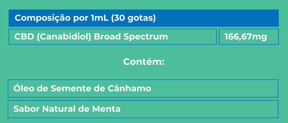 Sugestão de Uso: Uso sublingual. Recomenda-se iniciar o tratamento (primeira semana) com 10 gotas diárias (55,55mg de CBD Broad Spectrum), mantendo na região sublingual por 30 segundos antes de engolir. Após a primeira semana, caso não tenha atingido efeito satisfatório, aumentar em 2 gotas a cada semana, até a obtenção da resposta terapêutica.
