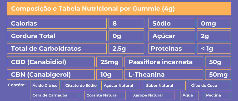 A formulação do SativaMed Ultra Sleep Gummies possui um blend de fitoterápicos. Além do CBN e do CBD, possui Passiflora incarnata (utilizada para aliviar o estresse, ansiedade, depressão e insônia, por aumentar os níveis de receptores GABA) e L-Theanina (aminoácido que promove relaxamento mental e corporal, aumento do desempenho cognitivo – sem causar nervosismo ou outros efeitos colaterais – status emocional e qualidade do sono). Produto livre de THC.